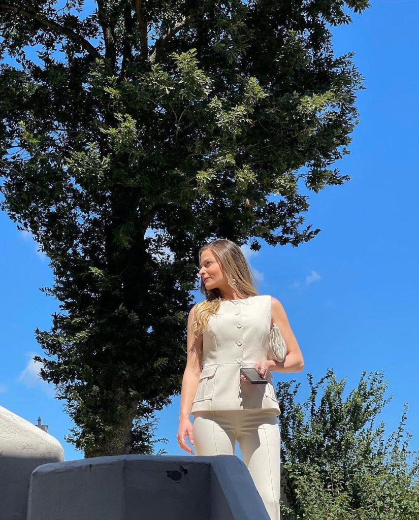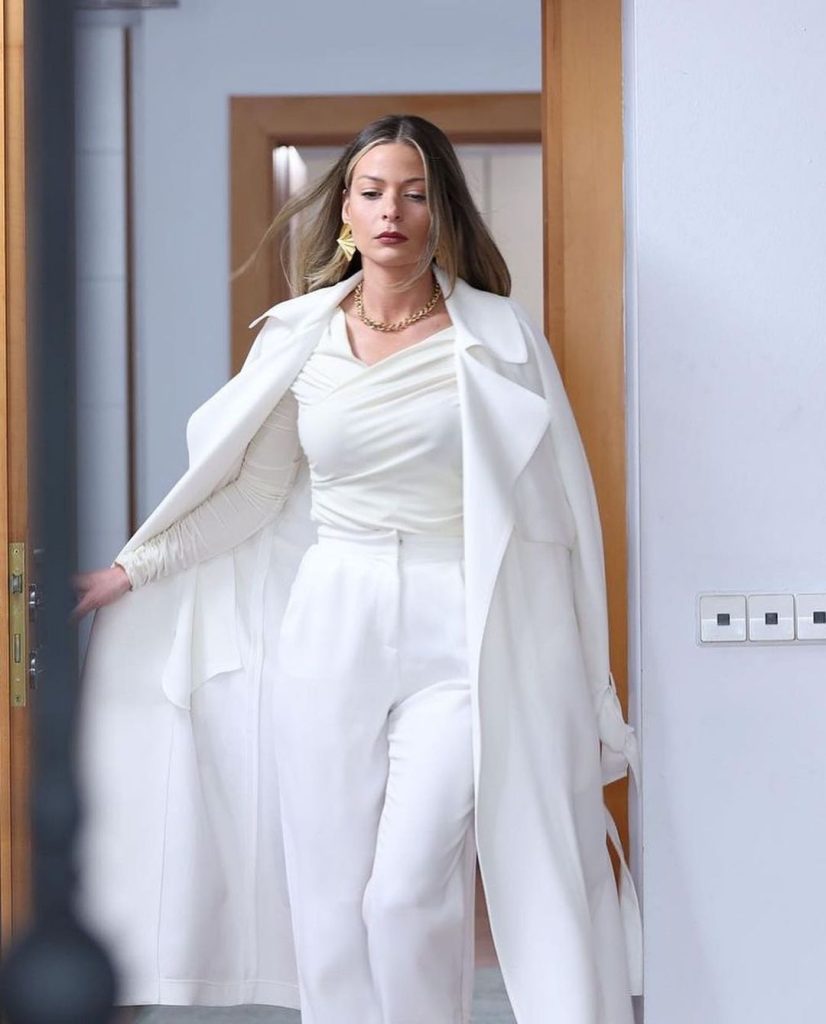 كما أن إطلالتها في المسلسل لم تخلو من بعض اللمسات الكلاسيكية بأسلوب عصري مميز، فاختارت أقراط مميزة وعصرية متدلية بحجم كبير، مع جاكيت جيليه رسمي لاقى رواجاً كبيراً هذا الموسم، مع بنطال كلاسيكي بنفس اللون والقماش، تميز بقصته الواسعة، مع قميص أبيض اللون.