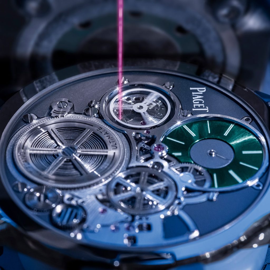 ساعة Altiplano Ultimate Concept Tourbillon قطعة محدودة الإصدار تُظهر التالّق التقني والنحافة الملحوظة بسماكة لا تبلغ 2 ملم. تتميز هذه الساعة بأجهزتها الزرقاء الأنيقة مع مكوّنات من الذهب و PVD في لعبة جريئة بألوان Piaget.