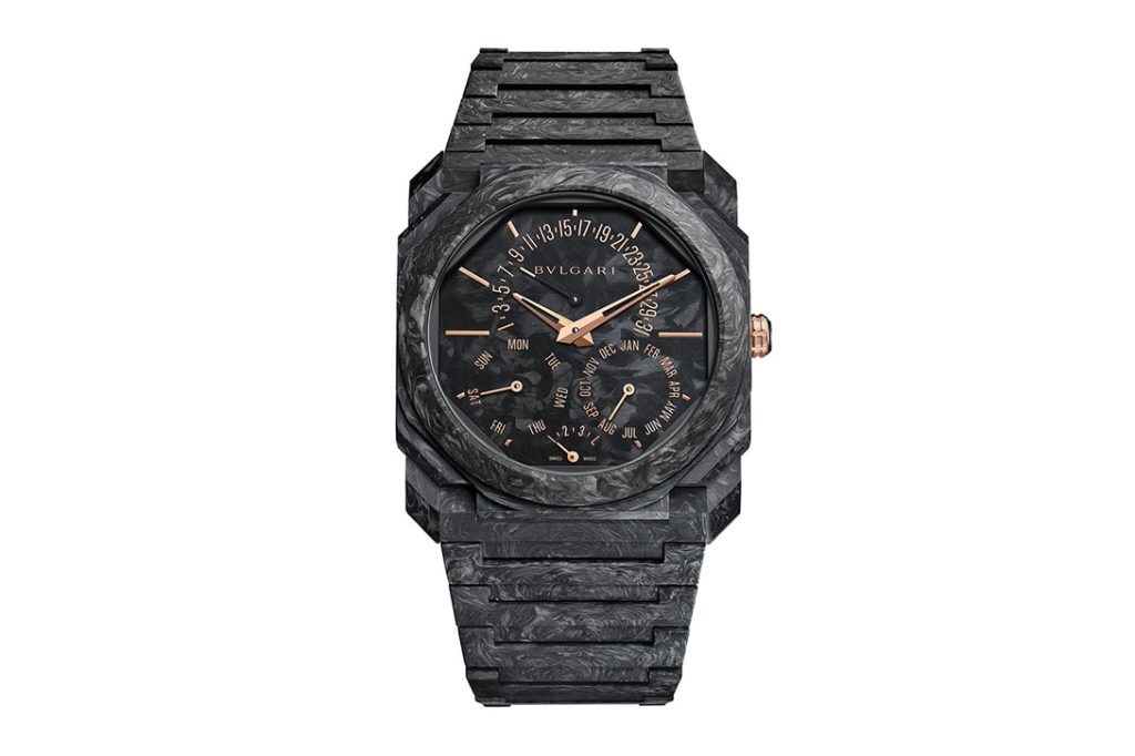 تم إطلاق ساعتي “Octo Finissimo Carbon Gold” من خلال إعادة تصميم أيقونة Octo Finissimo الأيقونية من Bulgari، وتزويدها بألوان ومواد فريدة لإبراز التميز. تتميز الساعتان الجديدتان بطبقة “Carbon Gold”، التي تجمع بين الكربون عالي التقنية والتصميم الأنيق للذهب، وتتميز كلتا الساعتين بعلبة بحجم 40 ملم وتتميز بميناء أنيق يمتزج بشكل مثالي مع المؤشرات والعقارب المصنوعة من الذهب الوردي. لديهم أيضًا أقراص فرعية وسوار كربون مطابق.