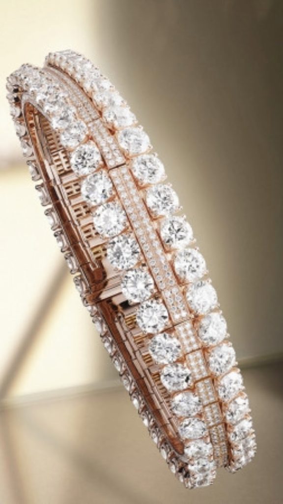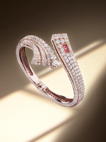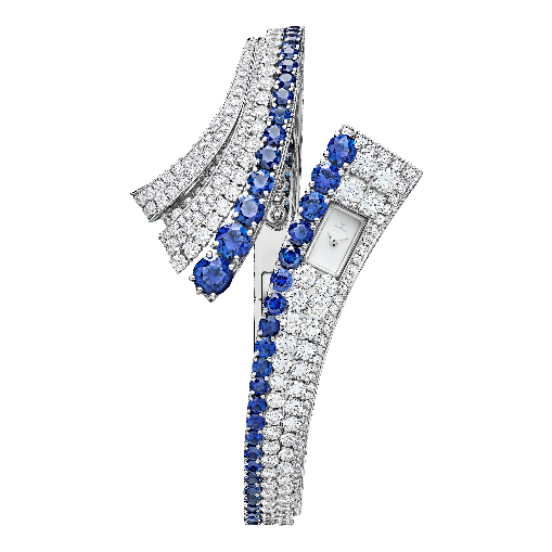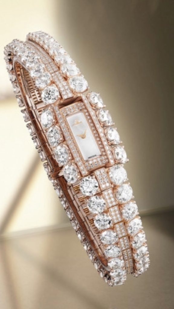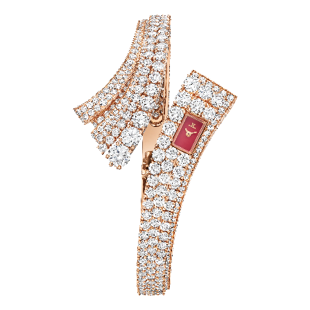 - السر الثاني هو آلية جديدة مخبأة داخل صفوف من الألماس. هذه الآلية دقيقة للغاية لدرجة أنها تظل غير مرئية تقريبًا، ولا يعرف موقعها سوى المرأة التي ترتدي الساعة، فعندما تضغط بلطف على “الزر” المخفي، ينفتح جزء صغير من السوار مثل صفحات الكتاب، ليكشف عن الوقت على ميناء متوهج من عرق اللؤلؤ، وعندما تترك الزر، يختفي القرص ويصبح السوار مرة أخرى نهرًا متدفقًا لا نهاية له من الماس.