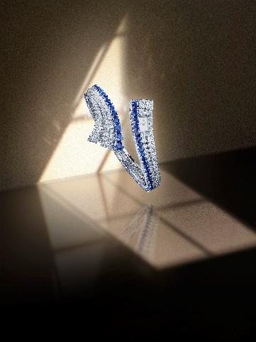 ثم تتدرج قطع الماس الأكبر حجمًا بشكل غير محسوس ويتم ترصيعها بتناسق مثالي. يوفر الترصيع الحبيبي للصفوف الداخلية من الماس مرساة بصرية للأحجار الأكبر حجمًا، ويؤكد، جنبًا إلى جنب مع الماس الذي يحيط بالميناء، على هندسة التصميم المستوحاة من فن الآرت ديكو. ولإضفاء مزيد من الضوء على القطعة، تم ترصيع شكل السوار أيضاً بالألماس.