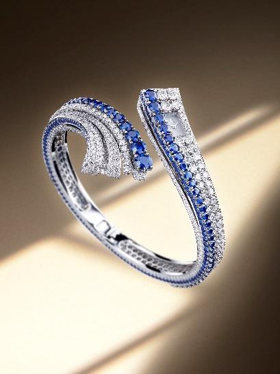 - الإصدار الثاني مصنوع من الذهب الأبيض ويتميز بميناء مطلي باللون الأبيض الثلجي ومرصع بالياقوت الأزرق، وقد تم تعزيز المنحنيات الواسعة للتصميم من خلال صف من أحجار الياقوت المقطوعة بشكل لامع، متدرجة الحجم وملتفة حول المعصم بالكامل، ويتم تضخيم اللون الأزرق للأحجار من خلال صف من الياقوت المرصع في السوار، وتعززه الألوان الرائعة للماس الأبيض والذهب الأبيض، مع وجود 347 حجر ياقوت (10.29 قيراط) و645 ماسة (10.99 قيراط)، يمثل هذا الإصدار من 101 Bangle إجمالي 21.28 قيراطًا من الأحجار الكريمة.
