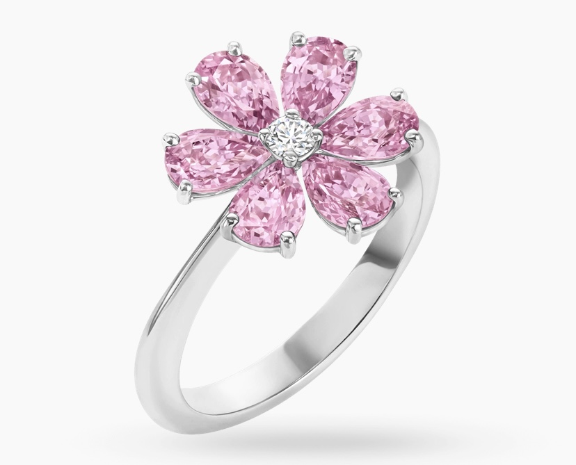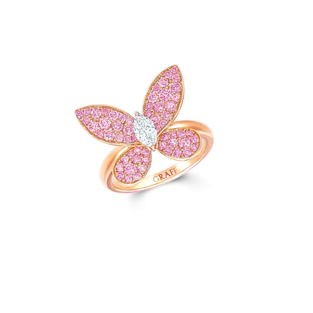 هو خاتم مصمم من الذهب الوردي والسفير الوردي المستدير، مع الذهب الأبيض المطلي بالروديوم والألماس، حيث تمزج هذه القطع البراقة بين الألوان والخطوط غير المتماثلة لتعيد تأويل رونق الفراشات وجمالها وهي تحلق في السماء، وكأن التصميم بمثابة أمل لكل محاربات سرطان الثدي، لذلك يمكنك الاعتماد عليه في إظهار دعمك لهم.