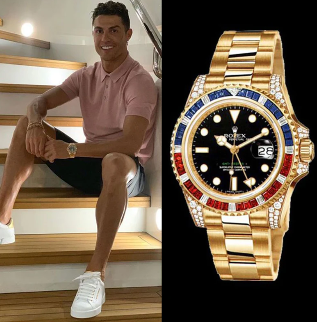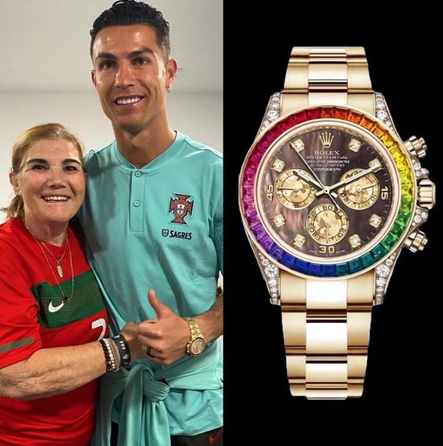 ظهر كريستيانو في صورة مع والدته عبر انستجرام وهو يرتدي ساعة رولكس دايتونا رينبو MOP، وهي ساعة فاخرة مصنوعة من الذهب الأصفر ومزودة بإطار مرصع بـ 36 قطعة من الياقوت المقطوع بلون قوس قزح.وميناء من عرق اللؤلؤ به 56 ماسة، ويبلغ سعرها 600 ألف دولار، وهي واحدة من أغلى ساعات رولكس في العالم.