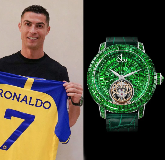 أحد ساعات رونالدو الفاخرة والتي تبلغ قيمتها نحو 780 ألف دولار، الساعة من طراز Jacob and Co. Caviar Flying Tourbillon Tzavorites، وهي مصنوعة من الذهب الأبيض ومزينة بأكثر من 130 حجرًا كريمًا مقطوعًا على شكل باغيت.