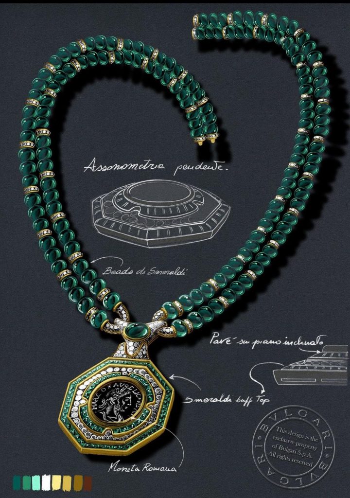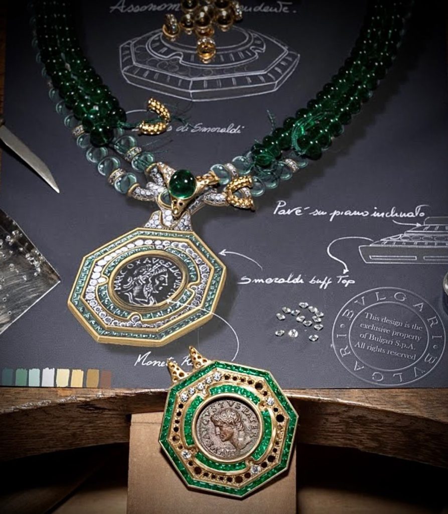 أطلق العنان لخيالك وتخيل قطعة فنية مذهلة تجمع بين الحاضر والماضي، هذا أقل ما يوصف به عقد Augustus Emerald Monete Sautoir الذي شهد حفل افتتاح فندق بولغاري في روما، الظهور الأول له، هذه القطعة المذهلة المستوحاة من الإمبراطورية الرومانية القديمة، حيث تدور الفكرة الرئيسية للتصميم حول عملة برونزية قديمة تعود إلى 14-37 م مع صورة الإمبراطور تيبيريوس أوغسطس، تتضمن نقشة مذبح السلام، وهو النصب التذكاري الذي يعكس الموقع الحالي لفندق بولغاري في روما، تتميز هذه القطعة الفريدة بالحرفية المتقنة والذوق الفني الرائع، إذ ضُمِّنَ فيها أكثر من 600 قيراط من خرز الزمرد وشلالاً من الماسات، تم تدمجهم بعناية فائقة وحرفية مذهلة لتخرج لنا هذه القطعة الفنية الرائعة التي تجسد مزيجاً مثالياً بين الحاضر والماضي.