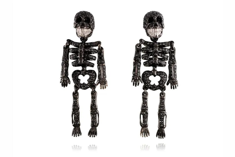 تشتهر صائغة المجوهرات الباريسية ليديا كورتاي بإبداعاتها التفصيلية، والتي غالبًا ما تكون ذات لمسة مروعة. تتميز هذه الأقراط بهياكل عظمية مبتسمة مع فم لامع بالماس الأبيض وأجسام مرصعة بالماس الأسود، تحتوي الذراعين والساقين على مفصلات، لذا فهي تتحرك عندما تتحرك.