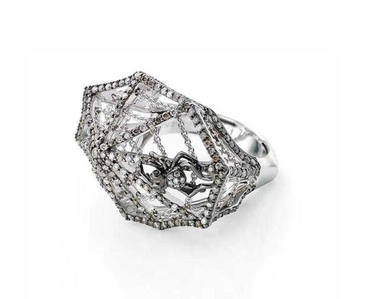 أيضاً تتميز مجموعات بيبي فان دير فيلدين بجرأة وحيوية، وتستكشف موضوعات متنوعة من مملكة الحيوان إلى الأساطير، وخاتمها العنكبوتي هو مثال بارز على أسلوبها الفريد حيث تتكون الشبكة من الماس والسلاسل، ويوجد عنكبوت أسود صغير في إحدى زواياها، انها قطعة فريدة من نوعها ومثيرة للاهتمام ستلفت بالتأكيد الأنظار.