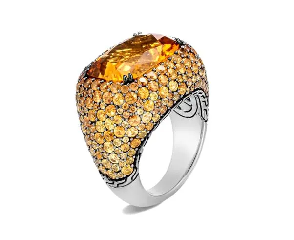 أيضاً هذا الخاتم من جون هاردي كاهايا الرائع يتميز بوجود حجر السترين اللامع في المنتصف، والذي تحيط به أحجار الياقوت البرتقالية والأصفر الرائعة في إطار مرصوف، كما تضيف الفضة الإسترلينية السوداء لمسة مخيفة قليلاً، مما يجعلها مثالية لأي شخص يبحث عن مظهر عيد الهالوين الجريء.
