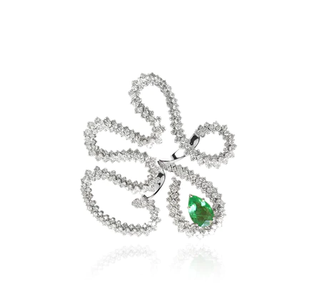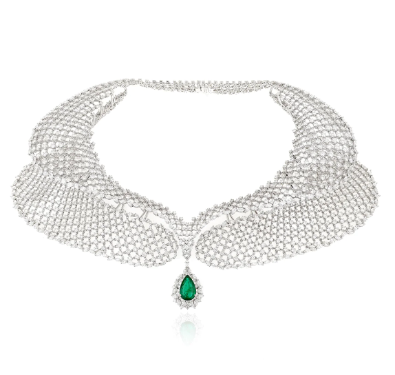 صنعت YEPREM هذه القلادة بإهتمام شديد بالتفاصيل، فهي تتميز بتصميم استثنائي ومبتكر يأتي على شكل ياقة مصنوع من الذهب الأبيض عيار 18 قيراط، ويجمع بين الماسات البيضاوية والدائرية، مع تمتعها بوضوح استثنائي من الفئة VVS VS ولون F G، ويضيف حجر الزمرد الجذاب لهذه القطعة الرائعة لمسة من اللون والعمق للتصميم الفاخر بشكل عام، وبفضل قطع الماس وترتيبها البارع، تخلق قلادة الشوكر هذه عرضًا مبهرًا من الضوء واللمعان، مما يجعلها قلادة لا مثيل لها ومثيرة للإعجاب حقًا.