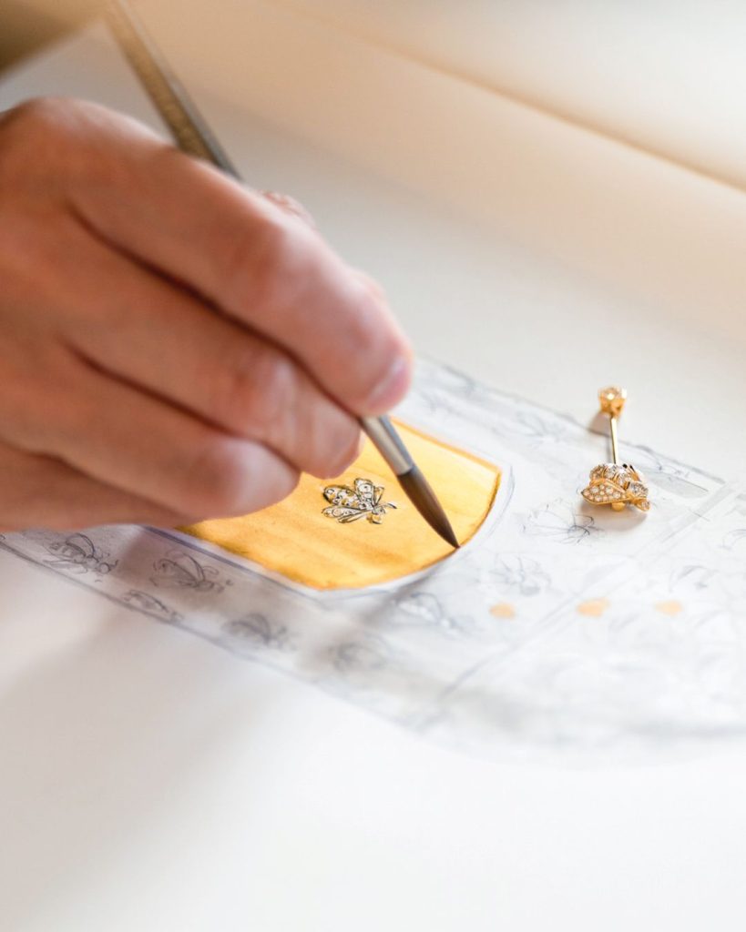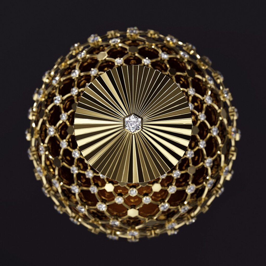 تم إنشاء هذا التصميم المعقد لخلايا النحل والماس بدقة وعناية كبيرتين، وتم تركيبه على هيكل من الأسلاك الذهبية الدقيقة، ولكن هناك المزيد، حيث تحتوي زجاجة Bouquet du Cour من Guerlain على سر، وهو حلقة فاخرة تحمل حجرًا مركزيًا رائعًا بحجم 2 قيراط من الطلاء الإمبراطوري وحصريًا لشوميه.