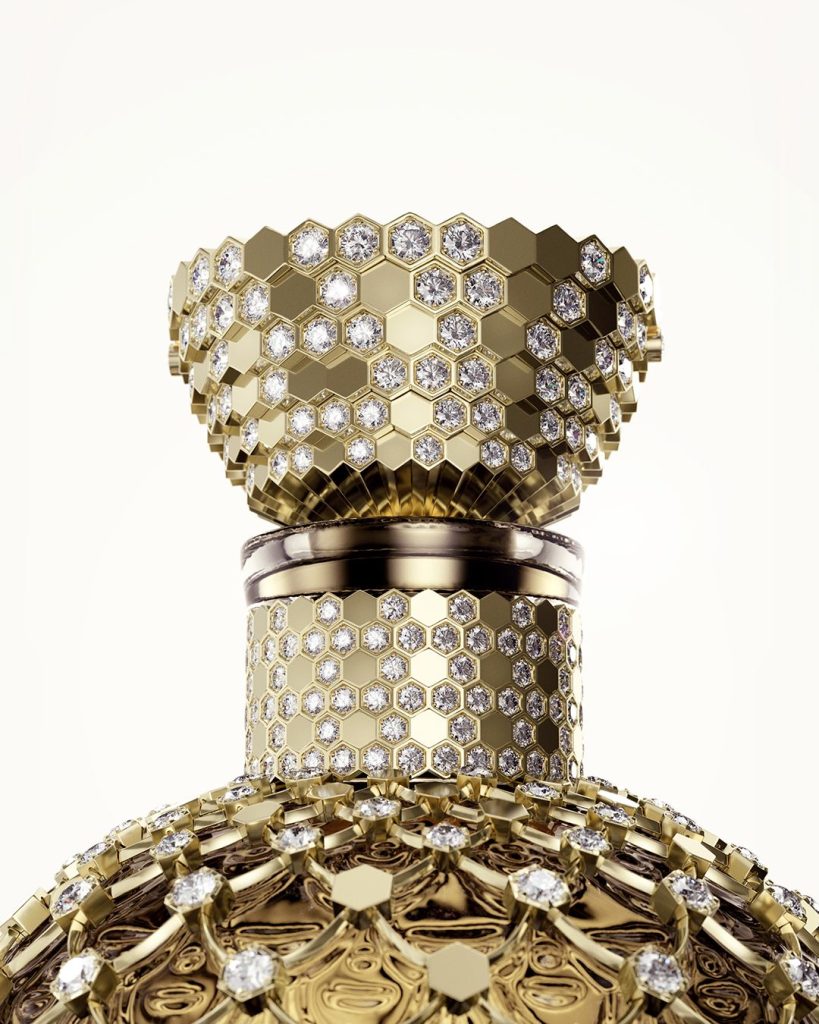تم تزيين عنق وحواف زجاجة النحل الفاخرة بطبقة من قرص العسل الذهبي المنحوت، تكريماً للنحلة الإمبراطورية، وقد استغرق تحضير باقة قرص العسل، حوالي 270 ساعة من العمل و336 ماسة بوزن إجمالي 55 قيراطاً، وتم ابتكار هذه القطعة الفريدة، ذات الخطوط الرشيقة والمغطاة بشبكة نحل ذهبية منقوشة يدوياً، في مشغل بوتيك Chaumet في 12 فاندوم.